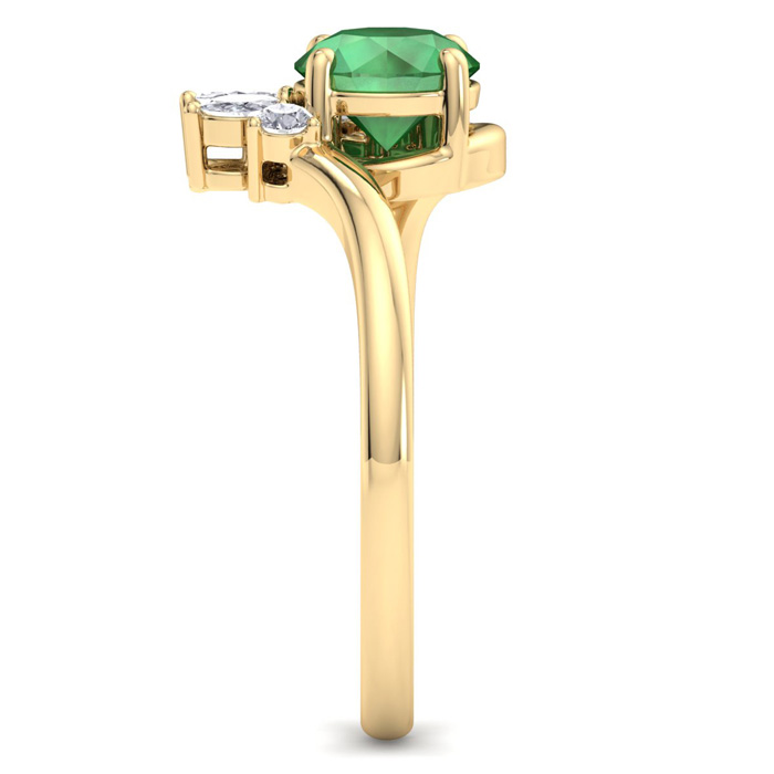 This gemstone ring features one 6mm round emerald gemstone weighing approximately 1 carat. There are 7 sparkling marquise and round diamonds in I-J color, I1-I2 clarity totaling approximately 1/4 carat. Total carat weight is 1 1/4 carats. This ring is in 14 karat yellow gold.