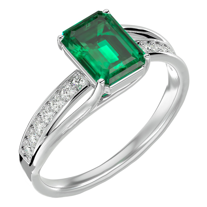 This emerald ring features one 8x6mm emerald shape created emerald gemstone. It is surrounded by 14 sparkling diamonds totaling 1/5 carat in I-J color, I1-I2 clarity. Total carat weight is approximately 1 3/4 carats. This ring is in sterling silver.