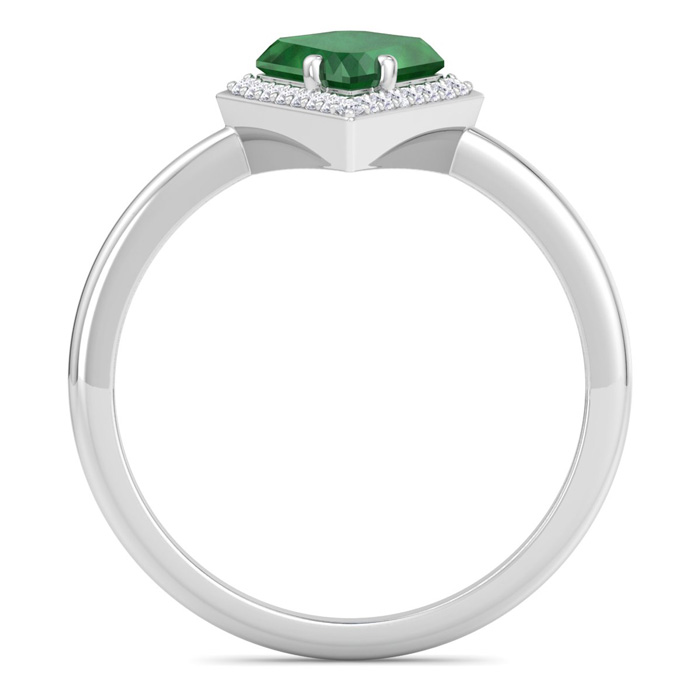 This gemstone ring features one 10x7mm kite shape created emerald gemstone weighing approximately 1 1/2 carats. There are 26 sparkling diamonds in I-J color, I1-I2 clarity totaling approximately 1/4 carat. Total carat weight is 1 3/4 carats. This ring is in 14 karat white gold.