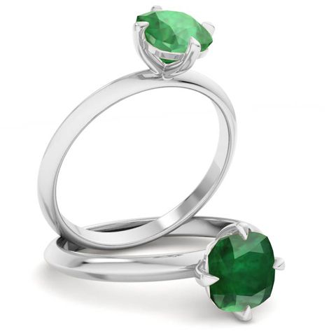 This gemstone ring features one 6mm cushion shape emerald gemstone weighing approximately 1 carat. This ring is in 14 karat white gold.