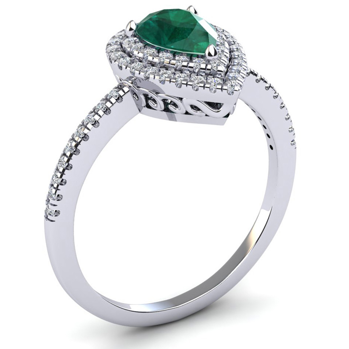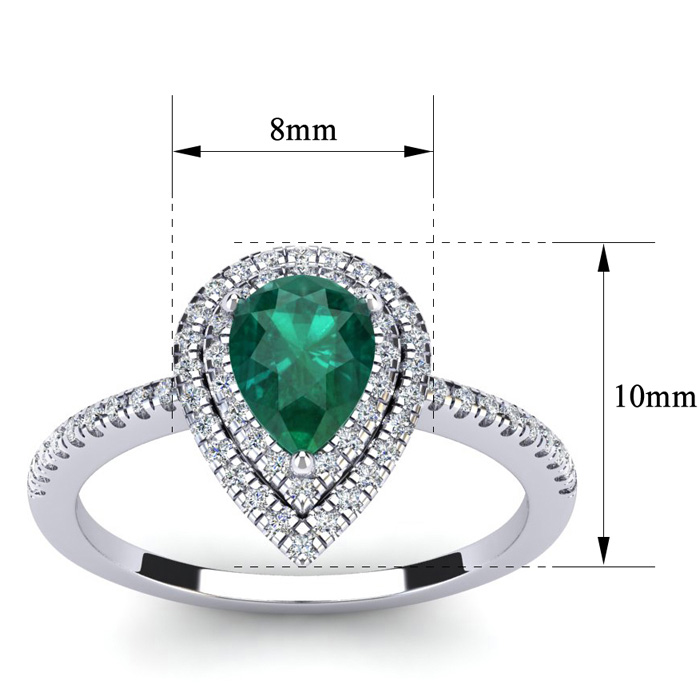 This emerald ring features one 7x5mm pear shape created emerald gemstone. It is surrounded by 62 sparkling diamonds totaling 1/3 carat in I-J color, I1-I2 clarity. Total carat weight is approximately 1 carat. This ring is in sterling silver.