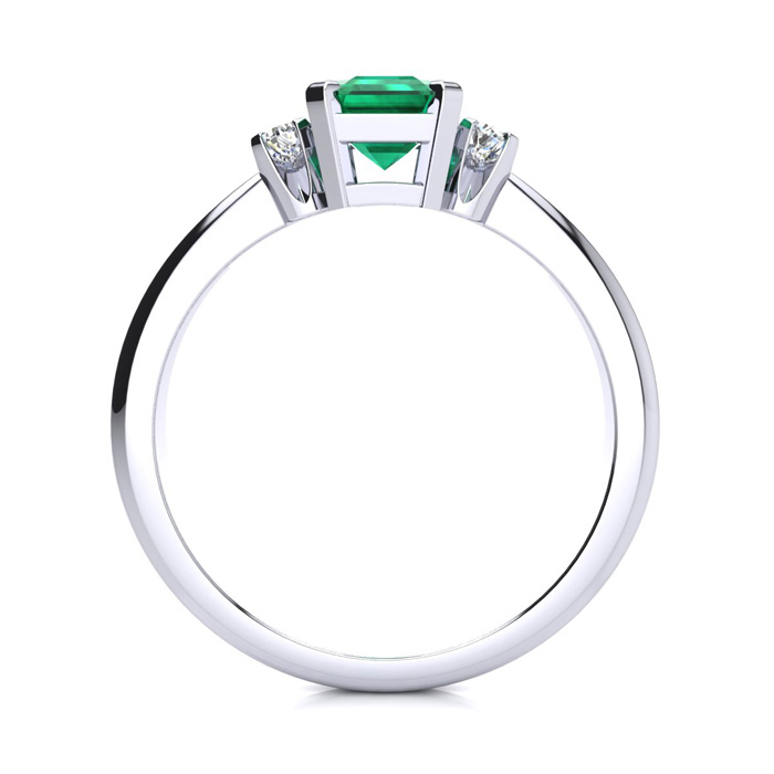 This emerald ring features one 9x7mm emerald cut created emerald gemstone. It is surrounded by two sparkling diamonds totaling 1/10 carat in I-J color, I1-I2 clarity. Total carat weight is approximately 2.60 carats. This ring is in sterling silver.