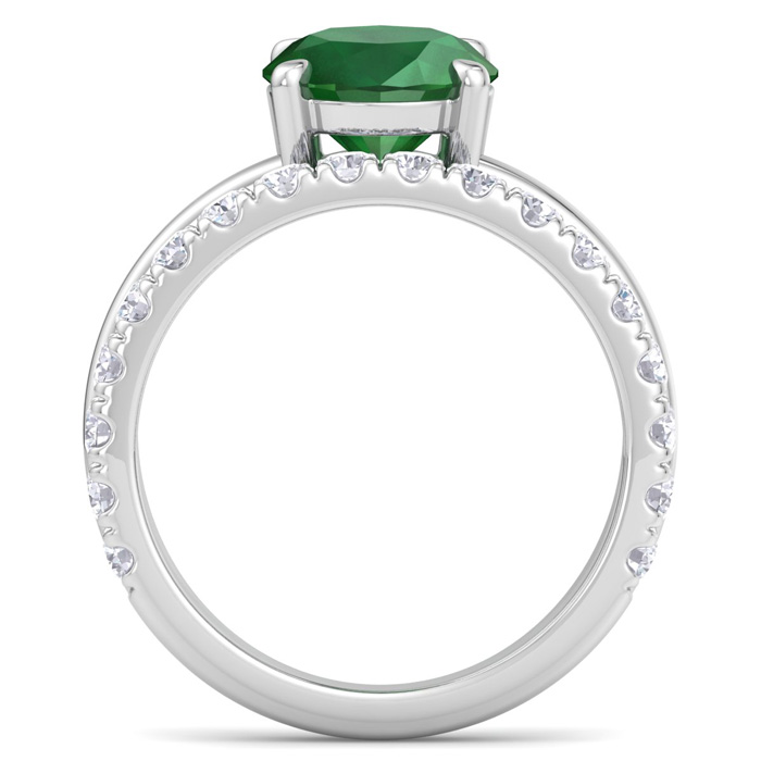 This elegant gemstone ring features one 10x8mm oval shape emerald gemstone at approximately 2 1/4 carats. It is surrounded by 18 sparkling diamonds in I-J color, I1-I2 clarity at 1/2 carat total weight. Total gem weight is approximately 2 3/4 carats. This ring is in 14 karat white gold.