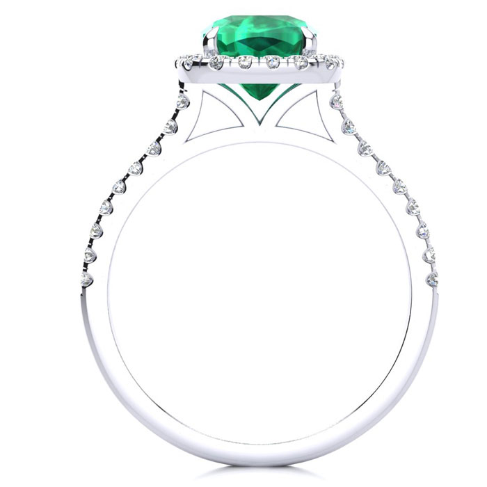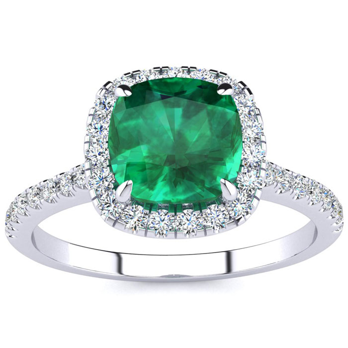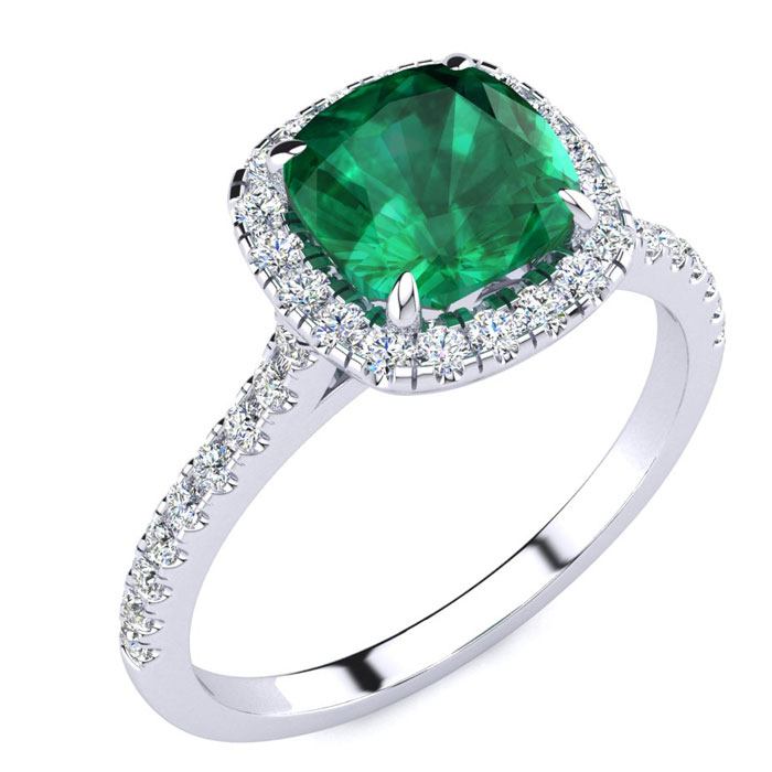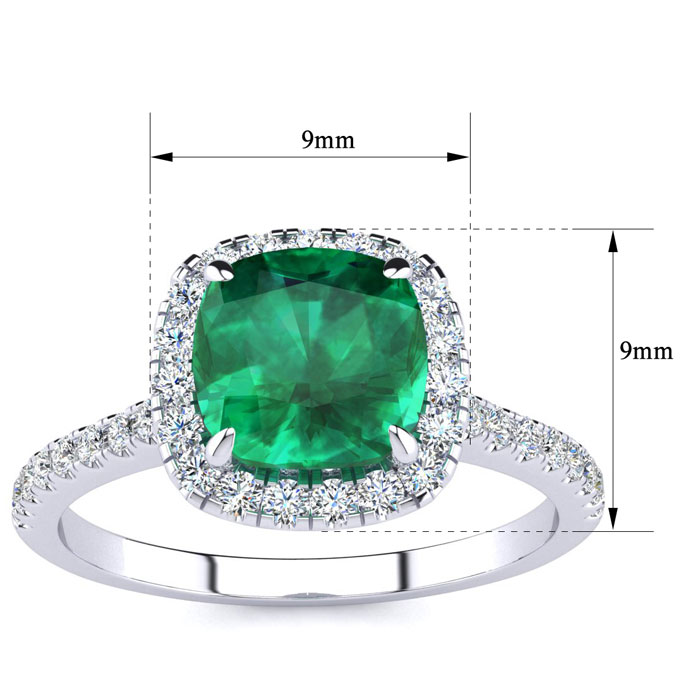 This emerald ring features one 7mm cushion cut created emerald gemstone. It is surrounded by 38 sparkling diamonds totaling 1/2 carat in I-J color, I1-I2 clarity. Total carat weight is approximately 2 carats. This ring is in sterling silver.