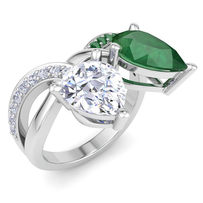3 1/2 Carat Emerald and Lab Grown Diamond Two Stone Engagement Ring In 14 Karat White Gold, Pear