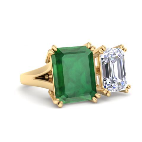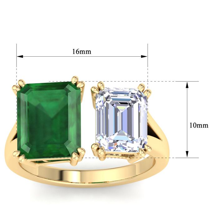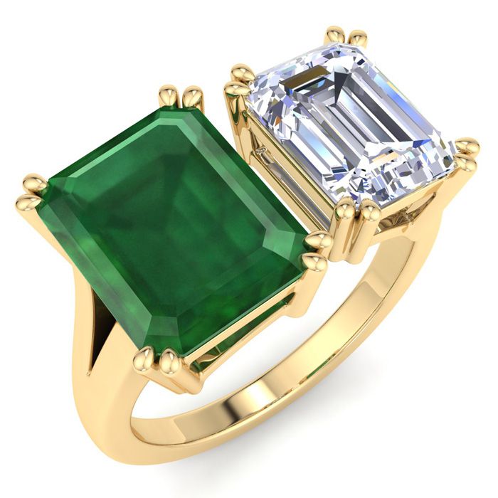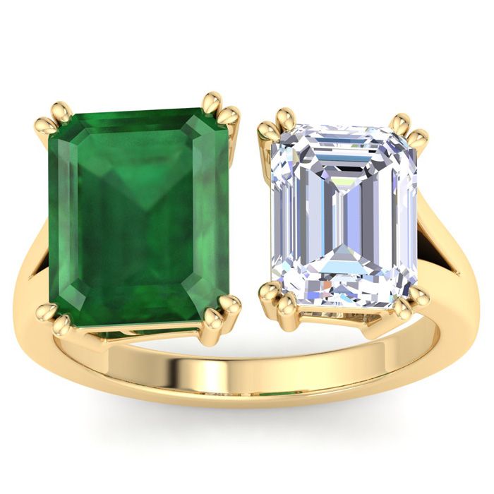 6 Carat Emerald and Lab Grown Diamond Two Stone Engagement Ring In 14 Karat Yellow Gold, Emerald