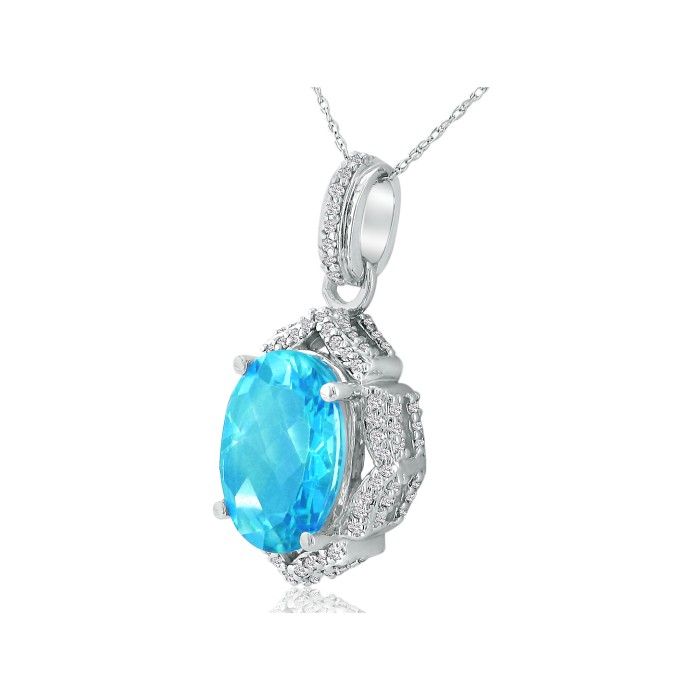 This is really an impressive piece. The topaz on this pendant is really gorgeous and the cut really showcases the beautiful gemstone. The diamonds make great accents. Pure classy with a "blue bling" edge.--GemDoe.