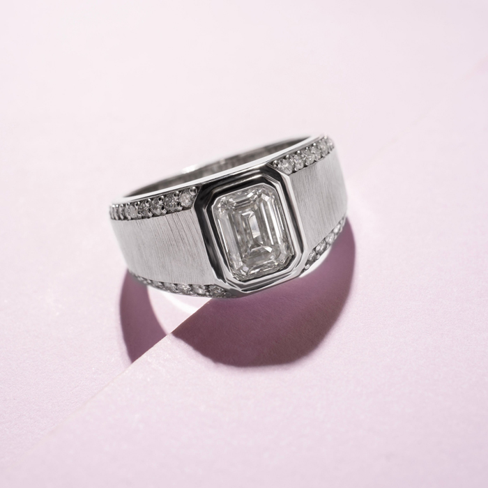 This Estate Jewelry mens ring features a 1 carat emerald cut center lab grown diamond. It is accented with 44 round lab grown diamonds in G-H color, VS clarity. Total carat weight is approximately 1 1/2 carats. This ring is in 14 karat white gold.