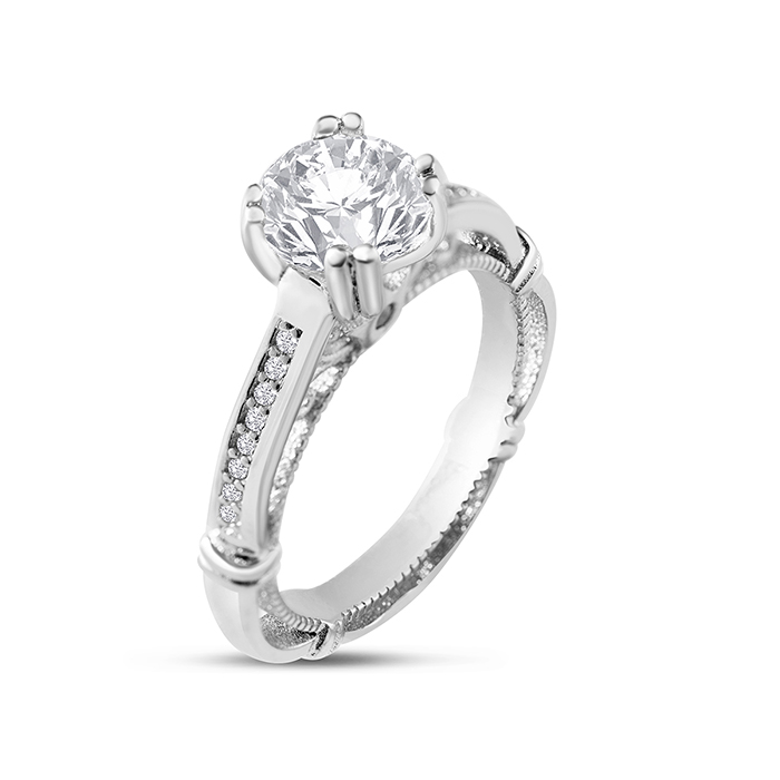 This Estate Jewelry engagment ring looks like a designer Verragio Parisian style. The ring is made of sterling silver and contains a center cubic zirconia that looks the size of a 1 carat round diamond with18 other smaller cubic zirconia gemstones that look like a total of 1/4 carat of small accent diamonds. The ring is quite impressive looking.
