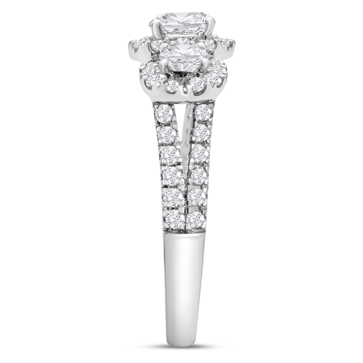 This Estate Jewelry lab grown diamond ring features 55 round lab grown diamonds with a halo in G-H color, VS clarity. Total carat weight is approximately 1 1/4 carats. This ring is in 14 karat white gold.