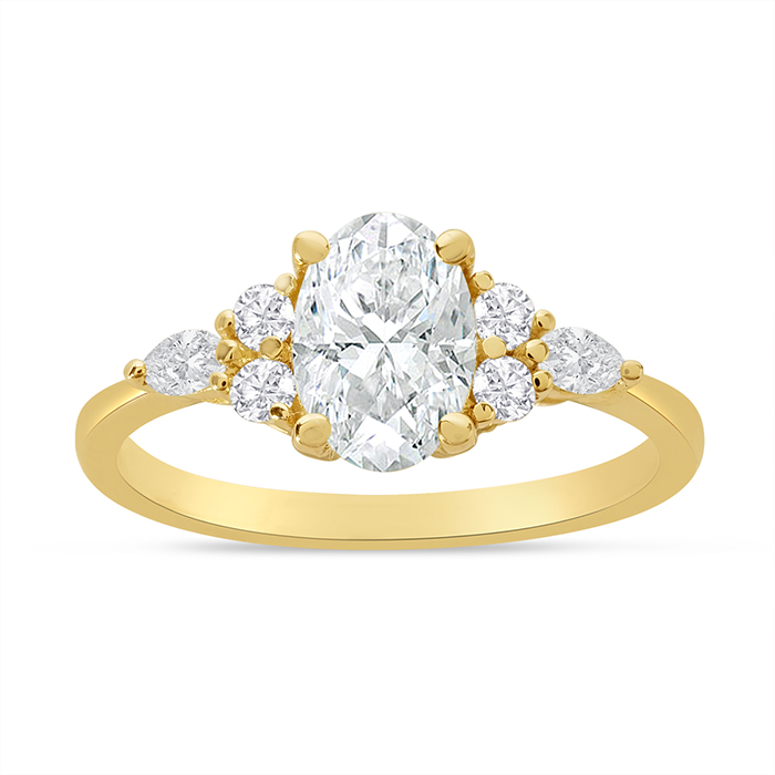 This amazing engagement ring features a 1 carat natural oval diamond center surrounded by marquise and round shape diamonds. This ring is in 14 karat yellow gold. Diamond color is H-I, diamond clarity is VS2.