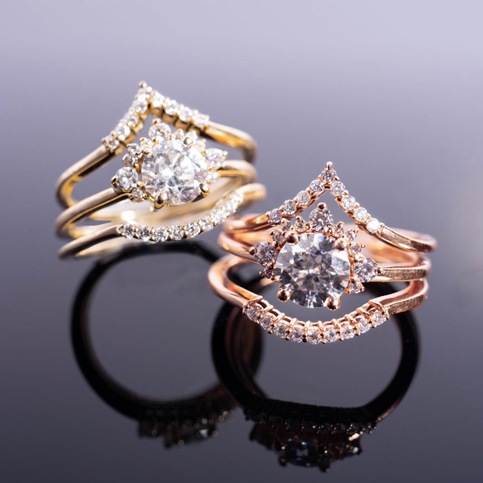 This Estate Jewelry bridal set features a 0.80 carat center lab grown diamond. It is accented with a crown of 29 diamonds plus 18 diamonds along the V band and C band in G-H color, VS clarity. Total carat weight is approximately 1 1/5 carats. This ring is in 14 karat yellow gold and in ring size 8.5