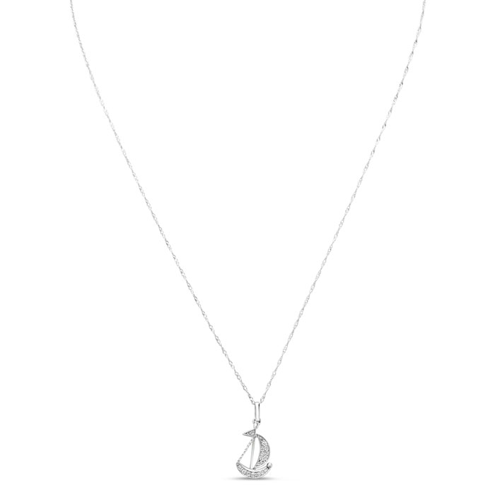 This amazing sailboat necklace features 20 sparkling diamonds in G-H color, VS2 clarity totaling 1/10 carat. This necklace is in 14 karat white gold and comes with an 18 inch rope chain with a spring-ring clasp, This pendant is 1/2 inch long!