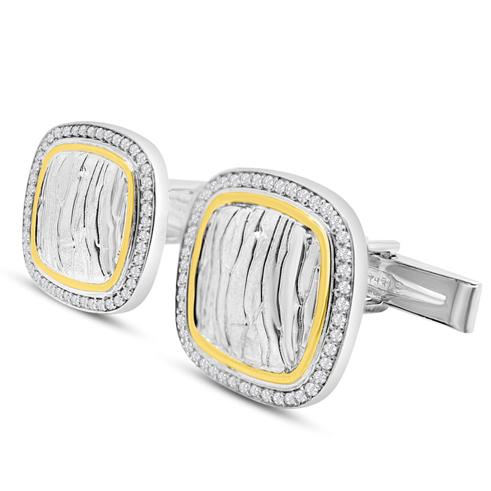 These cufflinks for men feature 80 sparkling diamonds in I-J color, I1-I2 clarity. Total carat weight is 1/2 carat. These cufflinks are in sterling silver and 14 karat yellow gold. Each cufflink measures approximately 1/2 inch.
