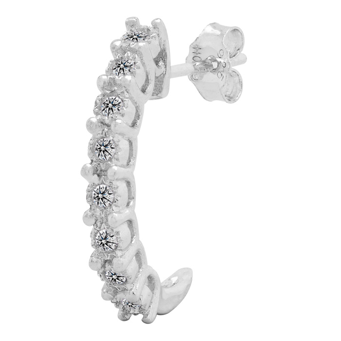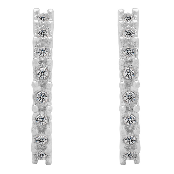 These diamond j hoop earrings feature 16 sparkling diamonds at G-H color, I2-I3 clarity. Total carat weight is 1/4 carat. Earrings hang down 1/2 inch and have comfortable and secure post with friction backs. Earrings are crafted in solid sterling silver.