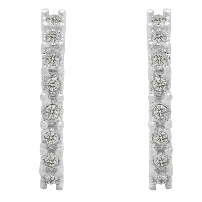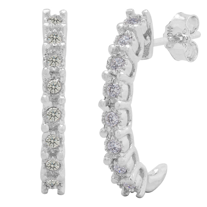 These diamond j hoop earrings feature 16 sparkling diamonds at J-K color, I2-I3 clarity. Total carat weight is 1/4 carat. Earrings hang down 1/2 inch and have comfortable and secure post with friction backs. Earrings are crafted in solid sterling silver.