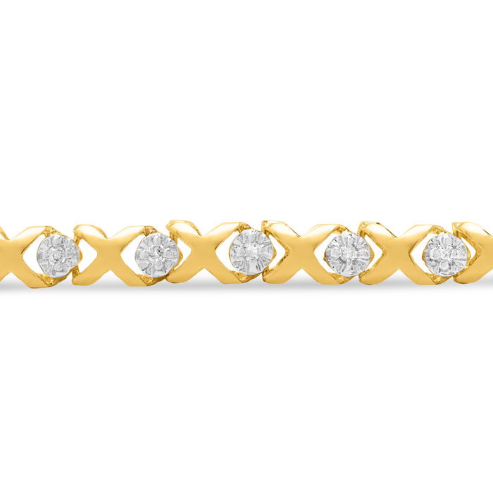 This Estate Jewelry tennis bracelet is in the lovely Hugs & Kisses XO's design. It contain 30 round shape natural earth-mined diamonds that weigh approximately 1/5 carat total and are in the quality range of I2-I3, J-K. The bracelet is crafted in 10 karat yellow gold and weighs approximately 6.0 grams. The length of the bracelet is 7 inches.