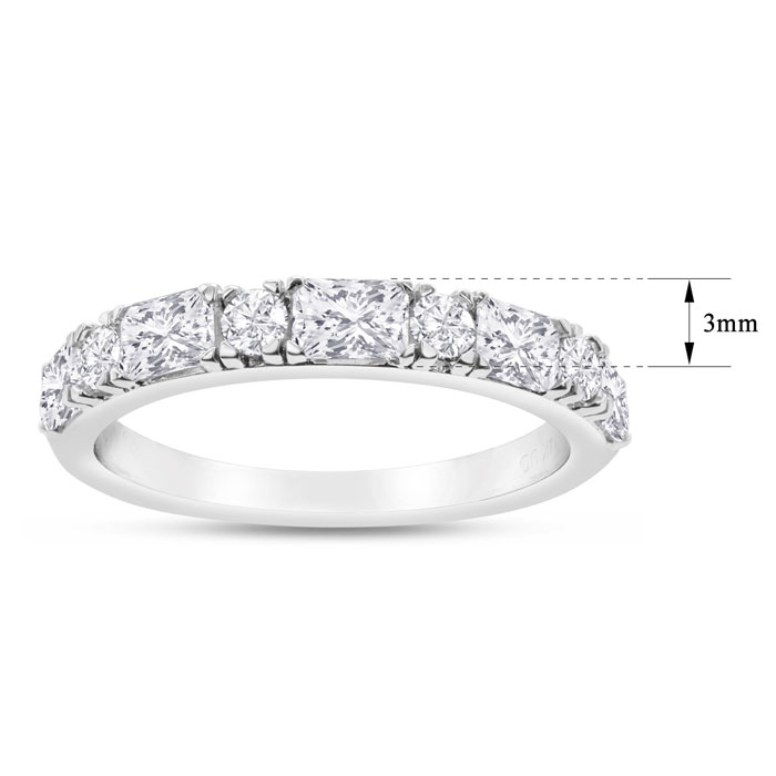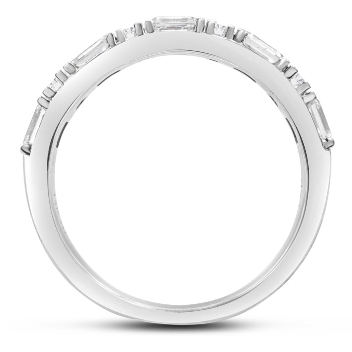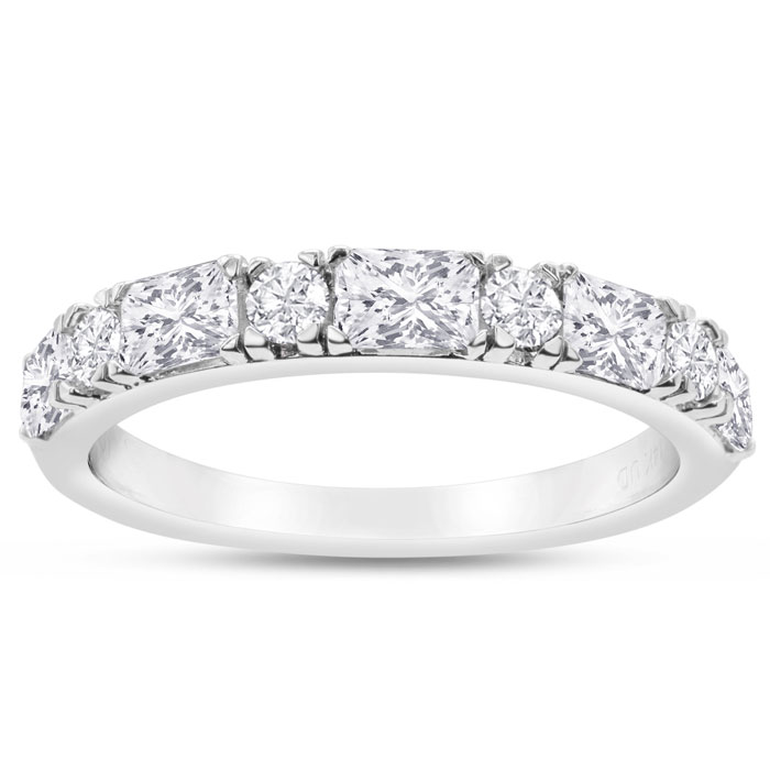 This Estate Jewelry wedding band ring features 4 round lab grown diamonds and 5 emerald cut lab grown diamonds in G-H color, VS-VS clarity. Total carat weight is approximately 1 carat. This ring is in 14 karat white gold and finger size 7.