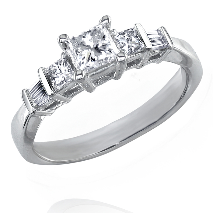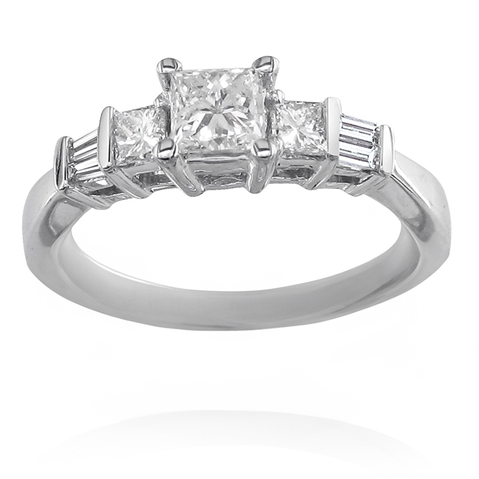 Sterling silver 1ct engagement ring including 1/2ct Princess Center cubic zirconia surrounded by princess and baguette shaped cubic zirconia gemstones.
