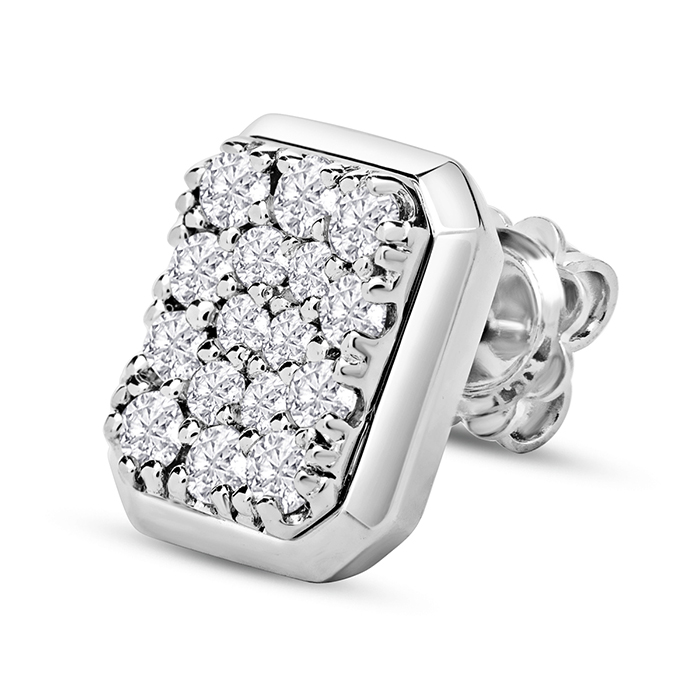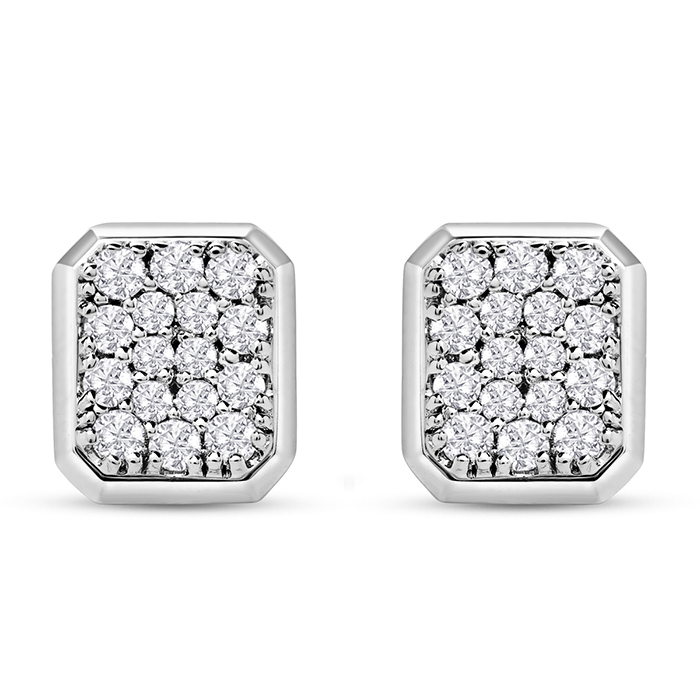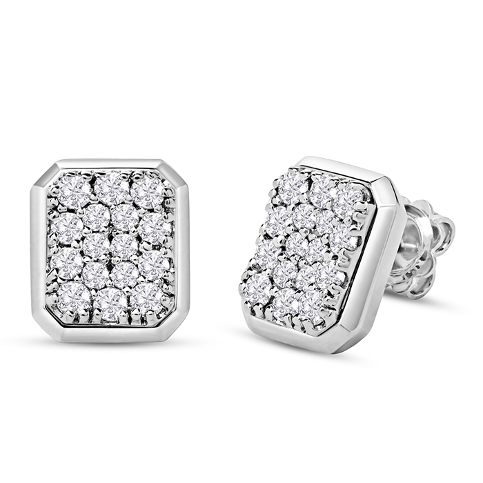 These earrings feature 32 sparkling diamonds in H-I color, SI2-I1 clarity weighing 1 1/4 carats. They are in a pave square setting in 14 karat white gold with secure backs.