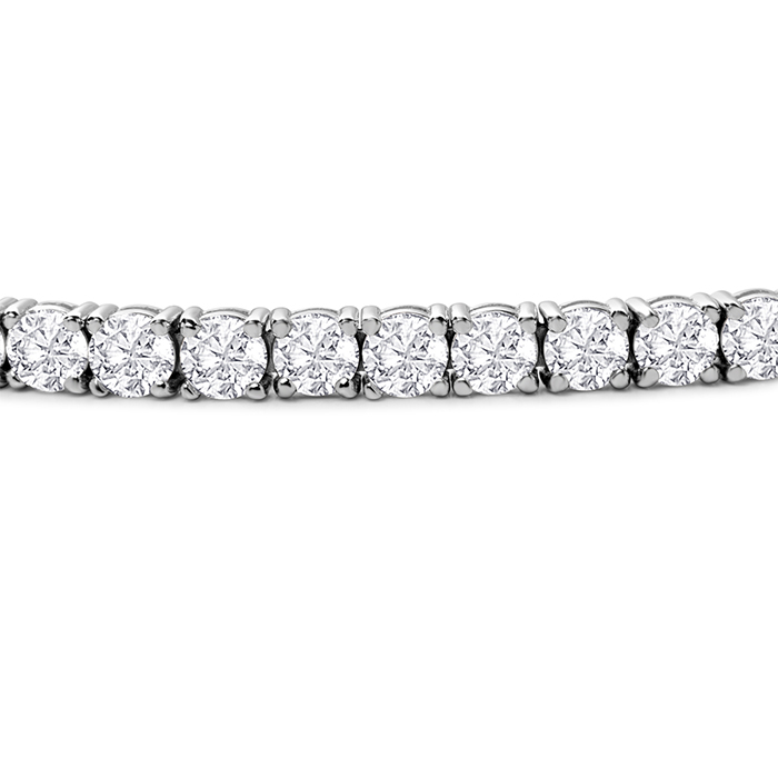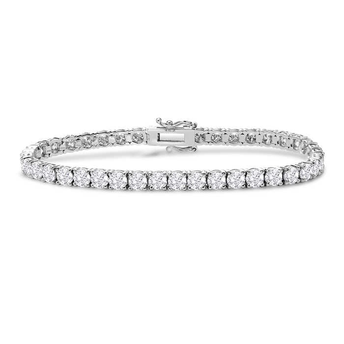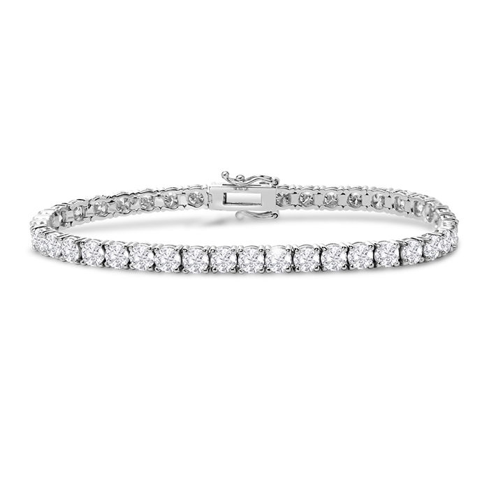 This bracelet features 41 sparkling lab grown diamonds in G-H color, VS clarity weighing 10 carats. This bracelet is in 14 karat white gold and has a secure box with tongue and safety clasp and fits a 7 inch wrist.