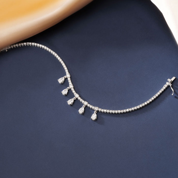 This bracelet features 77 sparkling round and 5 pear shape lab grown diamonds in G-H color, VS clarity weighing 4 1/2 carats. This bracelet is in 14 karat white gold and has a secure box with tongue and safety clasp and fits a 7 inch wrist.