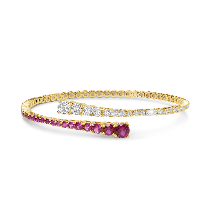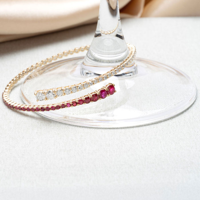 This bracelet features 20 sparkling lab grown diamonds in G-H color, VS clarity weighing 0.62 carats and 26 created ruby gemstones weighing 1.30 carats. This bracelet is in 14 karat yellow gold and hinges open to fit a 7 inch wrist.