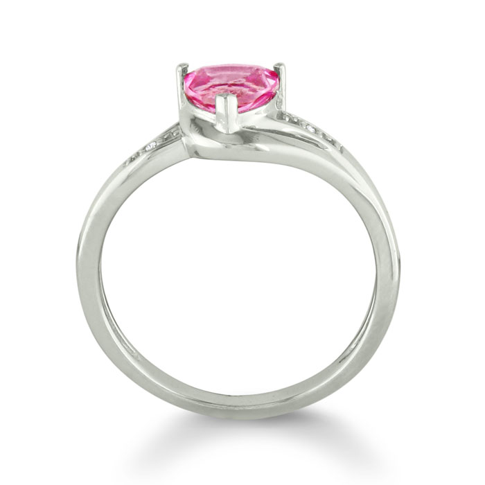 This Estate Jewelry created pink sapphire and diamond ring with a total gem weight of 3/4 carats is crafted in sterling silver. Diamond content is .01 carat in J/K color, I2 clarity. The ring size is 4.