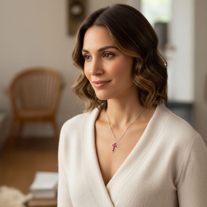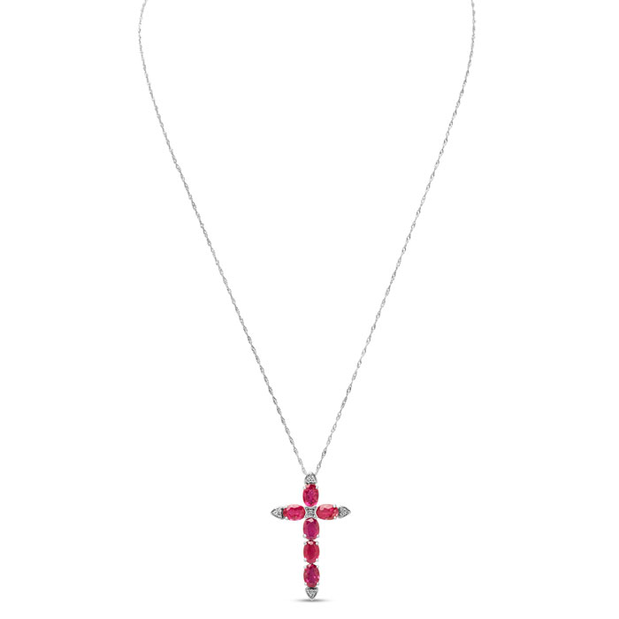 Estate Jewelry Diamond & Ruby Cross Necklace In 14 Karat White Gold, 18 Inches