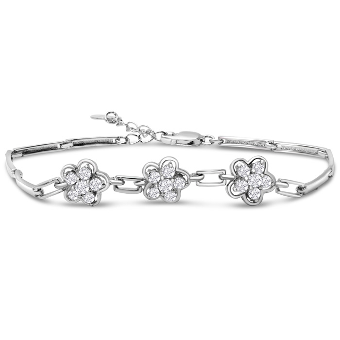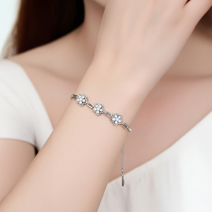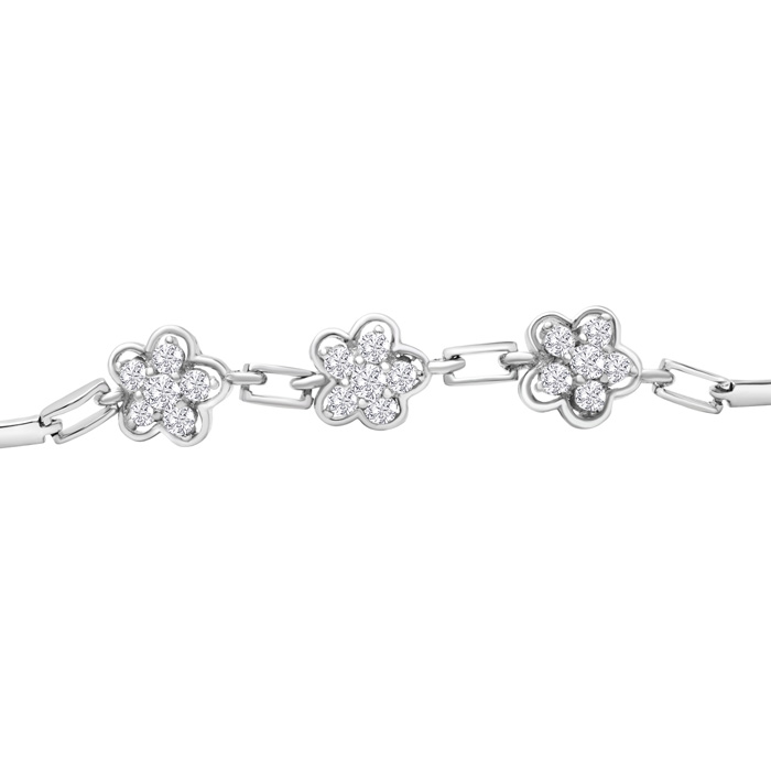 Estate Jewelry Three Flower Link Bracelet In Sterling Silver With Zirconias, 7 Inches