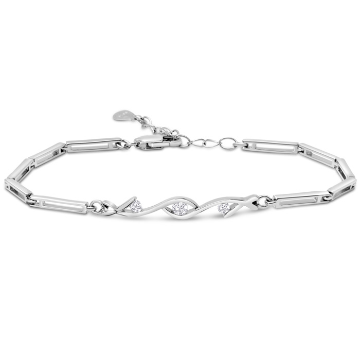This Estate Jewelry bracelet is lovely. It has three round cubic zirconia gemstones in a diamond-cut centerpiece top. The bracelet is crafted from sterling silver and has a lobster clasp with an adjustable extension for 6.5 to 7.5 inch lengths. The approximate weight of the bracelet is 4.2 grams.