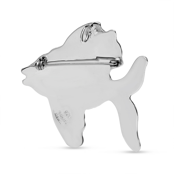 This Estate Jewelry angel fish brooch is a real statement piece and it can be worn as a necklace with your favorite chain. The brooch is crafted in solid sterling silver, and weighs approximately 14.7 grams. The eye of the angel fish is a high polished brass bead.