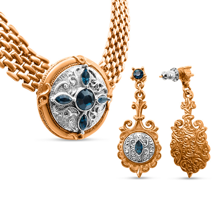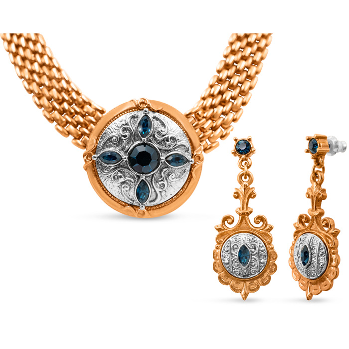 This is a special Estate Jewelry Vintage Necklace and Earrings Set. Both are made from a vintage rose copper alloy. The set is accented with 9 deep blue crystals: 3 round shaped, and 6 marquise shaped. The necklace is a beautiful 17 inch, 7-row panther link, and the dangling earrings are for pierced ears. This set does not qualify for our lifetime-warranty, but it is covered under our 60-day Money-Back Guarantee.