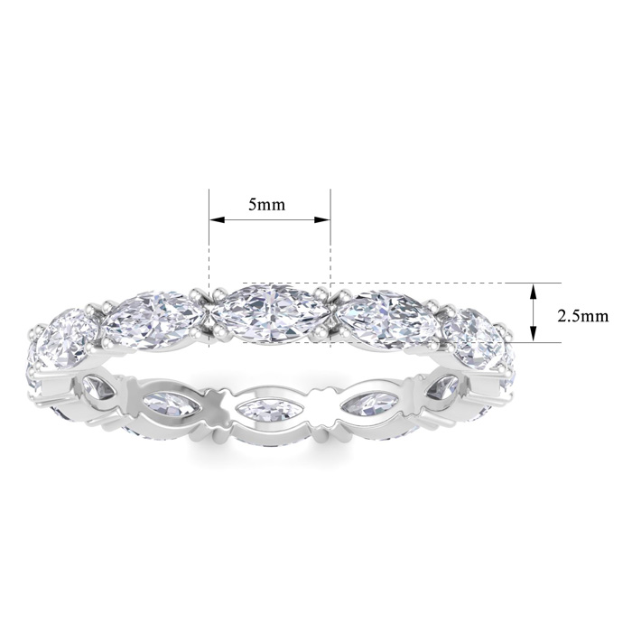 This lab grown diamond eternity ring features 11 marquise shape lab grown diamonds at approximately 1 2/3 carat total weight. Diamond color is G-H color, VS clarity. Ring is 5x2.5mm wide and is in 14 karat white gold.