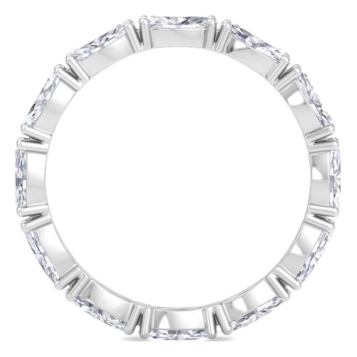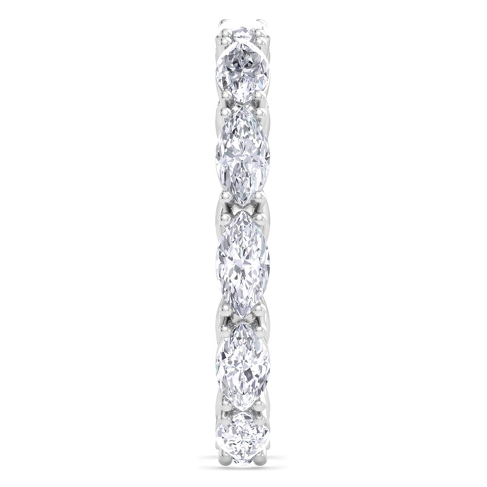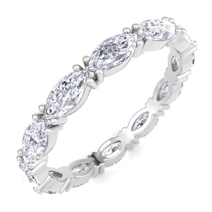 This lab grown diamond eternity ring features 11 marquise shape lab grown diamonds at approximately 1 2/3 carat total weight. Diamond color is G-H color, VS clarity. Ring is 5x2.5mm wide and is in 14 karat white gold.
