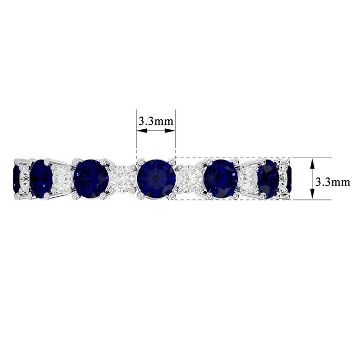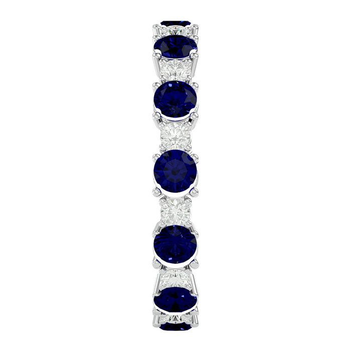 This classic moissanite eternity band features 11 round shape sapphire gemstones and 11 round shape moissanite gemstones at approximately 1 1/2 carat total weight. Moissanite color is E-F color, VVS1-VVS2 clarity. Ring is 3mm wide and is in 14 karat white gold.