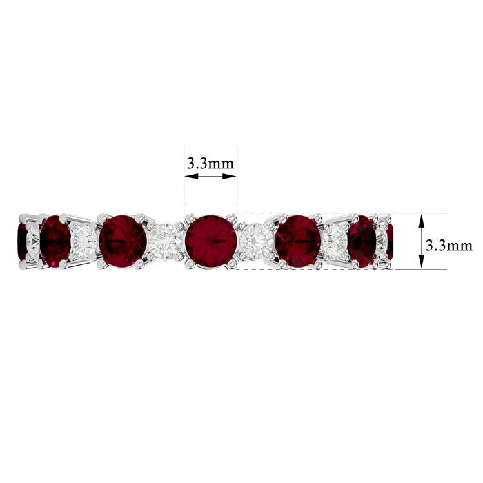 This classic moissanite eternity band features 12 round shape ruby gemstones and 12 round shape moissanite gemstones at approximately 1 1/2 carat total weight. Moissanite color is E-F color, VVS1-VVS2 clarity. Ring is 3mm wide and is in 14 karat white gold.