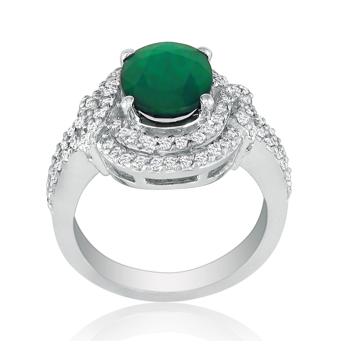 This gorgeous 4.12ct TGW emerald and diamond ring features eighty-eight shimmering diamonds coiling like rope around a perfectly cut 3.50ct oval emerald. The 88 diamonds total .62 carats and are I/J Color and I1-I2 clarity. The 14k white gold band is thick to ensure a lifetime of wearability in this stunning piece of emerald jewelry.