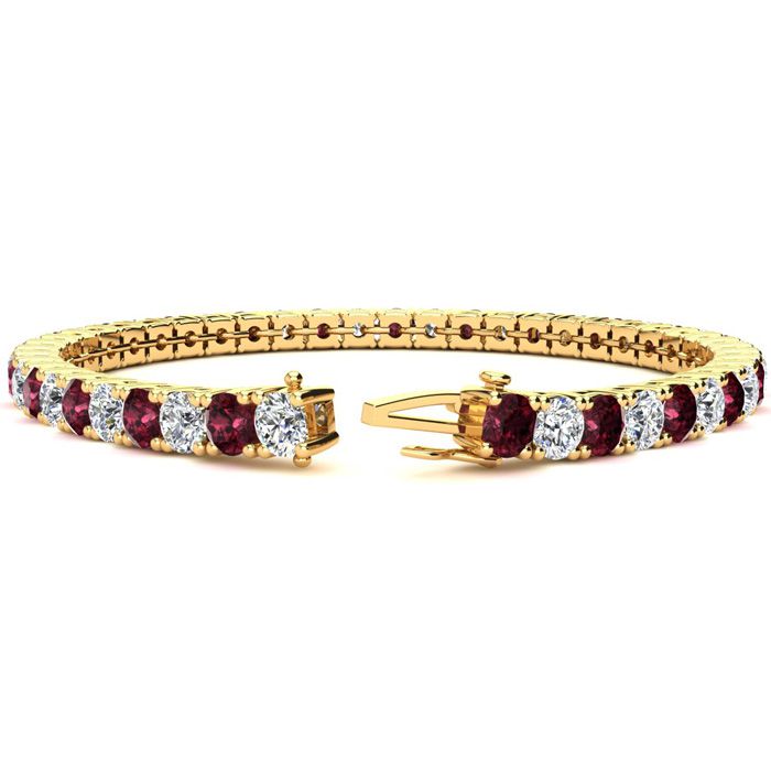 This classic gemstone bracelet features shimmering white diamonds in I-J color, I1-I2 clarity and garnet gemstones. The 6 inch bracelet contains 39 gemstones and diamonds at 8.18 carats. The 6.5 inch bracelet contains 42 gemstones and diamonds at 9.02 carats. The 7 inch bracelet contains 45 gemstones and diamonds at 9.66 carats. The 7.5 inch bracelet contains 49 gemstones and diamonds at 10.28 carats. The 8 inch bracelet contains 53 gemstones and diamonds at 11.12 carats. The 8.5 inch bracelet contains 56 gemstones and diamonds at 11.76 carats. The 9 inch bracelet contains 59 gemstones and diamonds at 12.38 carats. This bracelet is approximately 3.8mm wide and is crafted in 14 karat yellow gold. This bracelet has a secure, box with tongue and safety clasp.