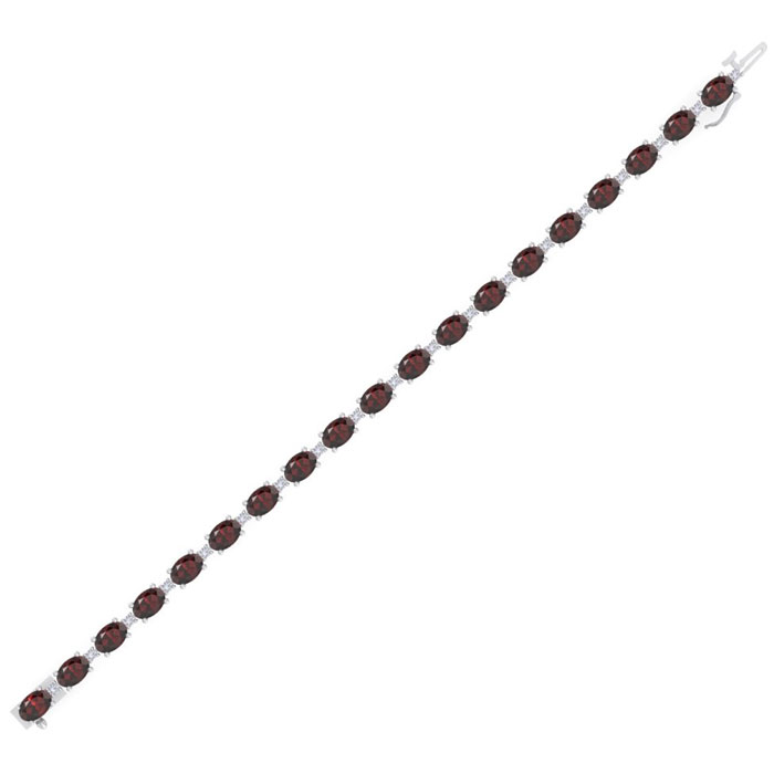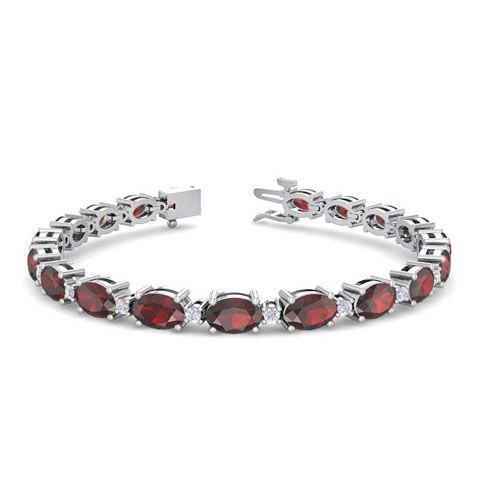This gemstone bracelet features 19 oval shape 6x4mm garnet gemstones totaling approximately 10 1/2 carats. There are 19 round shape diamonds in I-J color, I2 clarity totaling approximately 0.40 carats. Total carat weight is 11 carats. This gemstone bracelet is in 14 karat white gold and is 7 inches long. It comes with a secure box with tongue and safety clasp.