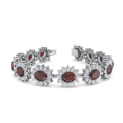 24 Carat Oval Shape Garnet and Halo Diamond Bracelet In 14 Karat White Gold, 7 Inches
