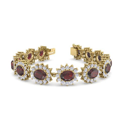 24 Carat Oval Shape Garnet and Halo Diamond Bracelet In 14 Karat Yellow Gold, 7 Inches