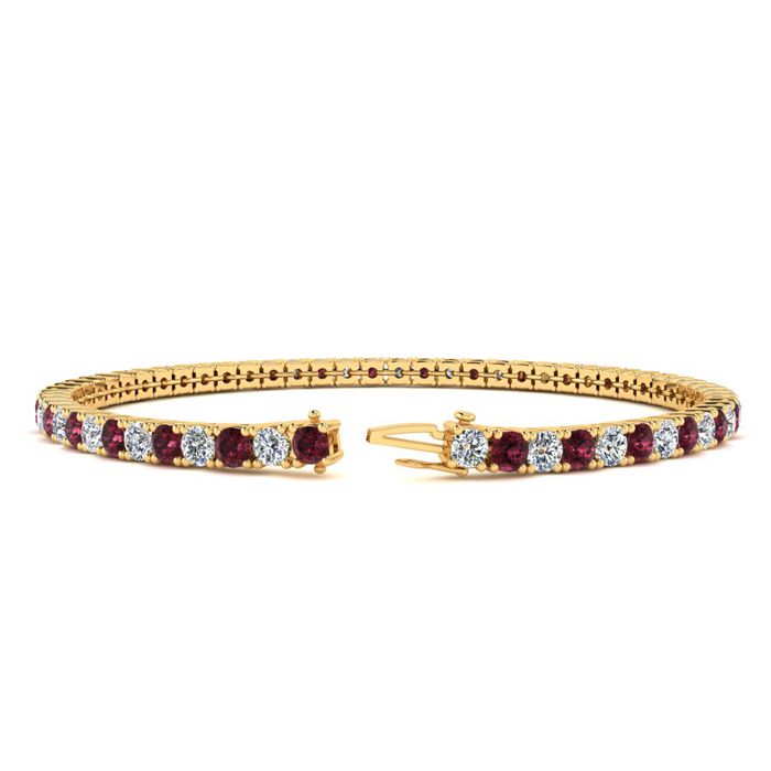 This classic gemstone bracelet features shimmering white diamonds in J-K color, I1-I2 clarity and garnet gemstones. The 6 inch bracelet contains 57 gemstones and diamonds at 2.56 carats. The 6.5 inch bracelet contains 62 gemstones and diamonds at 2.79 carats. The 7 inch bracelet contains 67 gemstones and diamonds at 3.01 carats. The 7.5 inch bracelet contains 72 gemstones and diamonds at 3.24 carats. The 8 inch bracelet contains 76 gemstones and diamonds at 3.42 carats. The 8.5 inch bracelet contains 81 gemstones and diamonds at 3.64 carats. The 9 inch bracelet contains 86 gemstones and diamonds at 3.87 carats. This bracelet is approximately 2.25mm wide and is crafted in 14 karat yellow gold. This bracelet has a secure, box with tongue and safety clasp.