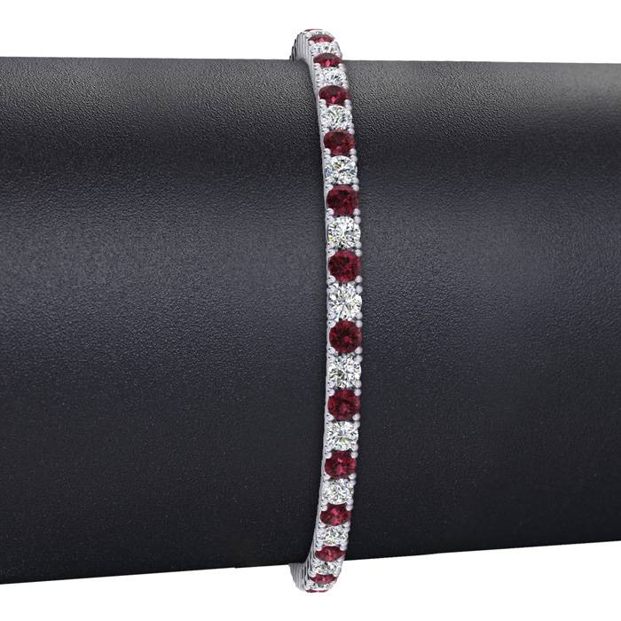 This classic gemstone bracelet features shimmering white diamonds in J-K color, I1-I2 clarity and garnet gemstones. The 6 inch bracelet contains 50 gemstones and diamonds at 3.77 carats. The 6.5 inch bracelet contains 55 gemstones and diamonds at 3.90 carats. The 7 inch bracelet contains 59 gemstones and diamonds at 4.22 carats. The 7.5 inch bracelet contains 63 gemstones and diamonds at 4.55 carats. The 8 inch bracelet contains 67 gemstones and diamonds at 4.81 carats. The 8.5 inch bracelet contains 72 gemstones and diamonds at 5.13 carats. The 9 inch bracelet contains 76 gemstones and diamonds at 5.46 carats. This bracelet is approximately 2.5mm wide and is crafted in 14 karat white gold. This bracelet has a secure, box with tongue and safety clasp.