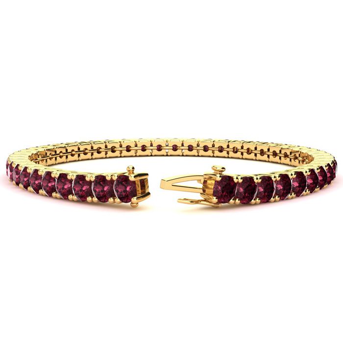 This classic gemstone bracelet features shimmering garnet gemstones. The 6 inch bracelet contains 39 gemstones at 8.58 carats. The 6.5 inch bracelet contains 42 gemstones at 9.46 carats. The 7 inch bracelet contains 45 gemstones at 10.12 carats. The 7.5 inch bracelet contains 49 gemstones at 10.78 carats. The 8 inch bracelet contains 53 gemstones at 11.66 carats. The 8.5 inch bracelet contains 56 gemstones at 12.32 carats. The 9 inch bracelet contains 59 gemstones at 12.98 carats. This bracelet is approximately 3.8mm wide and is crafted in 14 karat yellow gold. This bracelet has a secure, box with tongue and safety clasp.