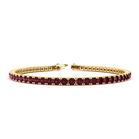 This classic gemstone bracelet features shimmering garnet gemstones. The 6 inch bracelet contains 50 gemstones at 4.05 carats. The 6.5 inch bracelet contains 55 gemstones at 4.20 carats. The 7 inch bracelet contains 59 gemstones at 4.55 carats. The 7.5 inch bracelet contains 63 gemstones at 4.90 carats. The 8 inch bracelet contains 67 gemstones at 5.18 carats. The 8.5 inch bracelet contains 72 gemstones at 5.53 carats. The 9 inch bracelet contains 76 gemstones at 5.88 carats. This bracelet is approximately 2.5mm wide and is crafted in 14 karat yellow gold. This bracelet has a secure, box with tongue and safety clasp.