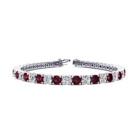 This classic gemstone bracelet features shimmering white diamonds in I-J color, I1-I2 clarity and garnet gemstones. The 6 inch bracelet contains 39 gemstones and diamonds at 8.18 carats. The 6.5 inch bracelet contains 42 gemstones and diamonds at 9.02 carats. The 7 inch bracelet contains 45 gemstones and diamonds at 9.66 carats. The 7.5 inch bracelet contains 49 gemstones and diamonds at 10.28 carats. The 8 inch bracelet contains 53 gemstones and diamonds at 11.12 carats. The 8.5 inch bracelet contains 56 gemstones and diamonds at 11.76 carats. The 9 inch bracelet contains 59 gemstones and diamonds at 12.38 carats. This bracelet is approximately 3.8mm wide and is crafted in 14 karat white gold. This bracelet has a secure, box with tongue and safety clasp.