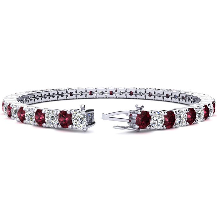 This classic gemstone bracelet features shimmering white diamonds in I-J color, I1-I2 clarity and garnet gemstones. The 6 inch bracelet contains 39 gemstones and diamonds at 8.18 carats. The 6.5 inch bracelet contains 42 gemstones and diamonds at 9.02 carats. The 7 inch bracelet contains 45 gemstones and diamonds at 9.66 carats. The 7.5 inch bracelet contains 49 gemstones and diamonds at 10.28 carats. The 8 inch bracelet contains 53 gemstones and diamonds at 11.12 carats. The 8.5 inch bracelet contains 56 gemstones and diamonds at 11.76 carats. The 9 inch bracelet contains 59 gemstones and diamonds at 12.38 carats. This bracelet is approximately 3.8mm wide and is crafted in 14 karat white gold. This bracelet has a secure, box with tongue and safety clasp.