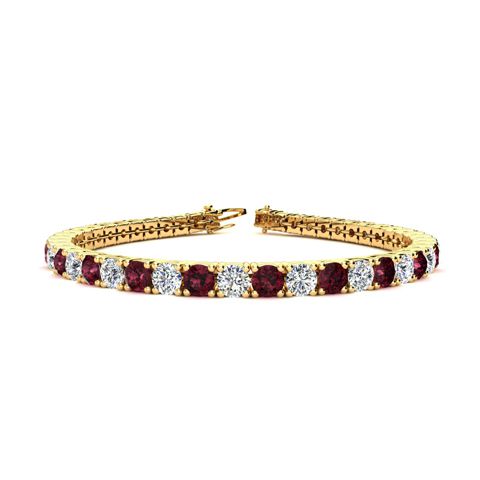 This classic gemstone bracelet features shimmering white diamonds in I-J color, I1-I2 clarity and garnet gemstones. The 6 inch bracelet contains 39 gemstones and diamonds at 8.18 carats. The 6.5 inch bracelet contains 42 gemstones and diamonds at 9.02 carats. The 7 inch bracelet contains 45 gemstones and diamonds at 9.66 carats. The 7.5 inch bracelet contains 49 gemstones and diamonds at 10.28 carats. The 8 inch bracelet contains 53 gemstones and diamonds at 11.12 carats. The 8.5 inch bracelet contains 56 gemstones and diamonds at 11.76 carats. The 9 inch bracelet contains 59 gemstones and diamonds at 12.38 carats. This bracelet is approximately 3.8mm wide and is crafted in 14 karat yellow gold. This bracelet has a secure, box with tongue and safety clasp.