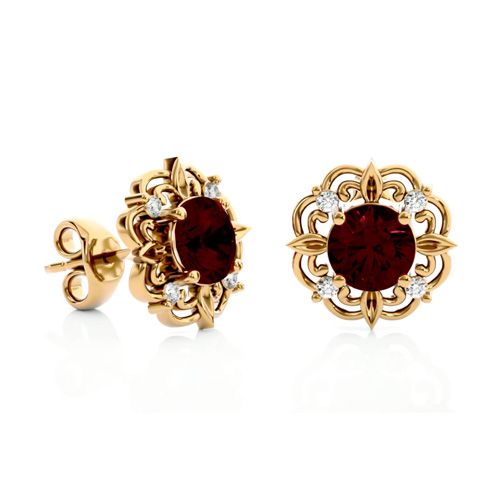 These elegant gemstone earrings feature two 6mm garnet gemstones at approximately 2 carats. They are surrounded by 8 sparkling diamonds in I-J color, I1-I2 clarity at 1/10 carat total weight. Total gem weight is approximately 2 1/10 carats. These earrings are in 14 karat yellow gold and have comfortable and secure friction backs.